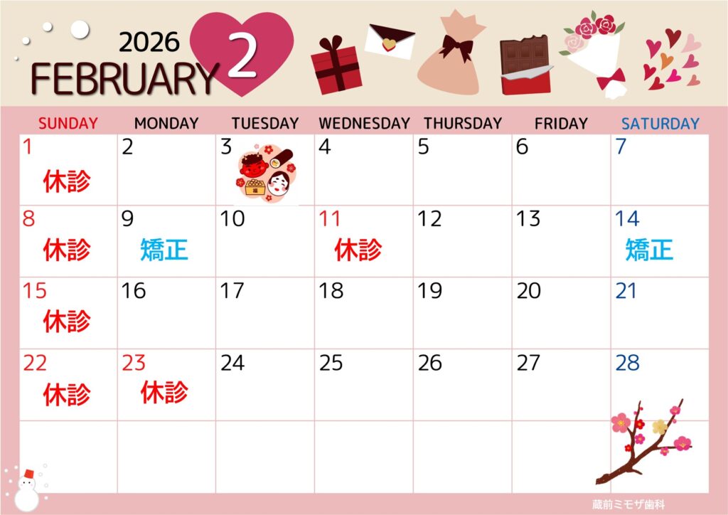 2026年1月19日 2月休診日のお知らせ 蔵前ミモザ歯科です👹🌸⛄🌈🐈 2月の休診日のお知らせです 矯正日は2/9(月) 14:30~、 と 2/14(土) 14:30~となっております。 2/11(水)と 2/23(月) は休診となります 。 ※初診の方は、虫歯治療希望・検診・クリーニング・ホワイトニング相談など、ご希望の内容をお確かめの上、ご予約ください。( ※マイナンバーカードまたは資格確認書を必ずご持参ください )