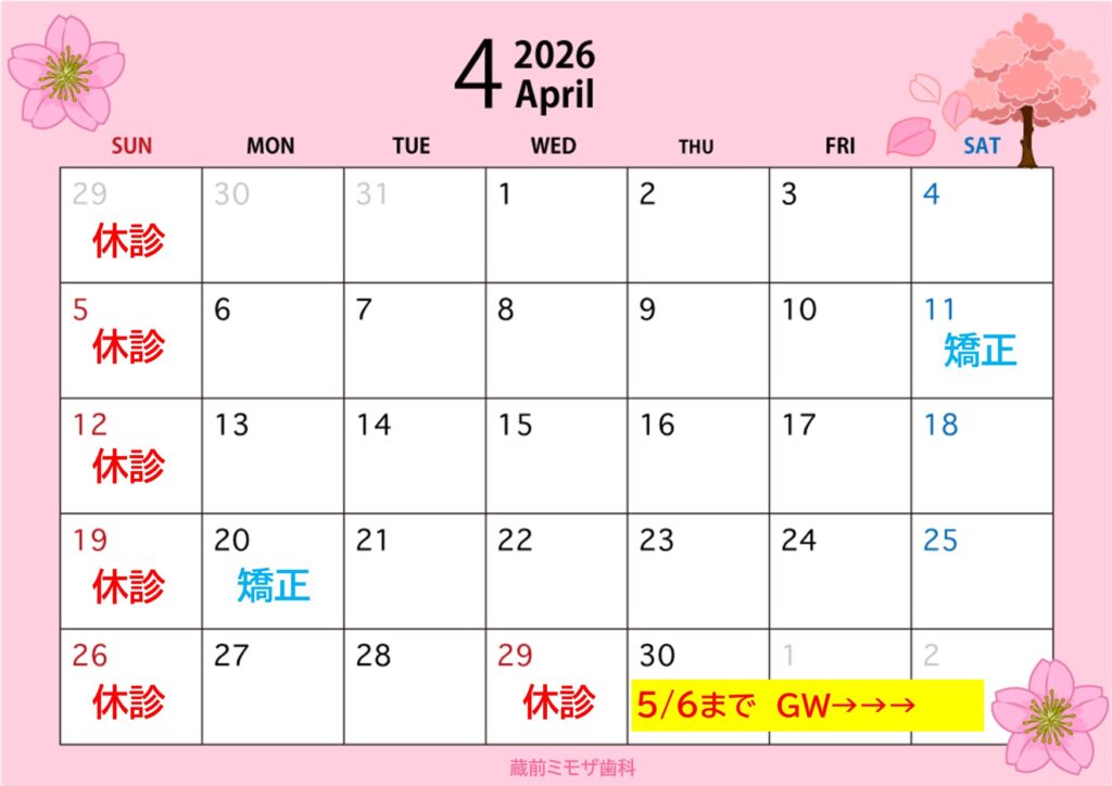 2026年3月21日 4月休診日のお知らせ蔵前ミモザ歯科です🌸🌹🌷🌈 4月の休診日のお知らせです 🦚✨🎏🍵🌸 矯正日は4/11(土) 14:30~、 と 4/20(月) 14:30~となっております。 4/29(水)~5/6(水)は休診となります 。 ※初診の方は、虫歯治療希望・検診・クリーニング・ホワイトニング相談など、ご希望の内容をお確かめの上、ご予約ください。( ※マイナンバーカードまたは資格確認書を必ずご持参ください )